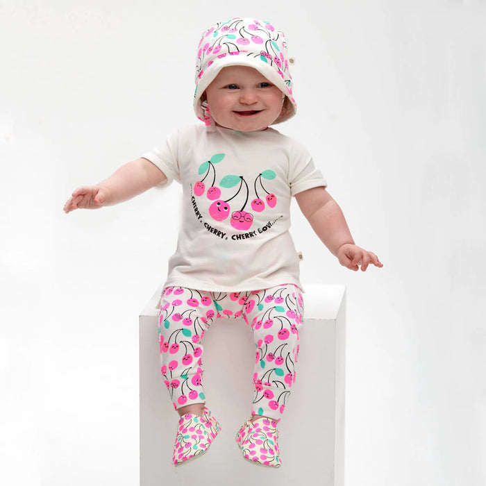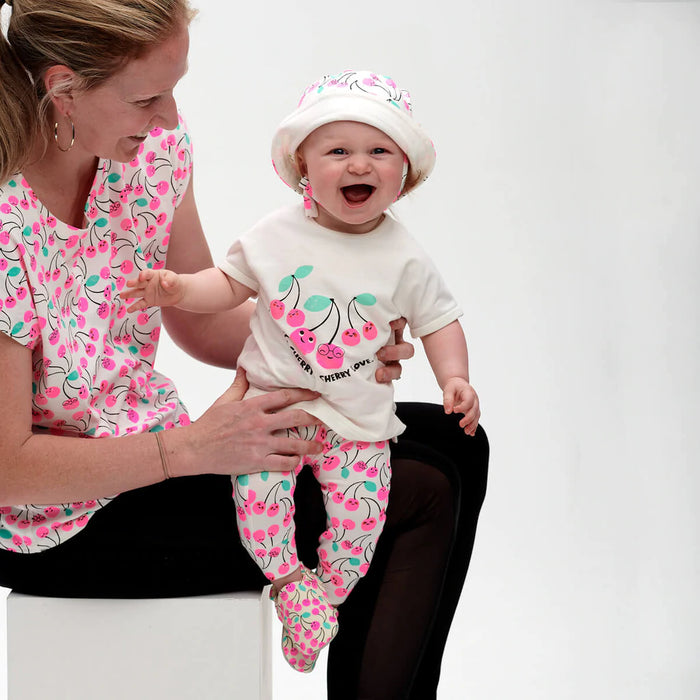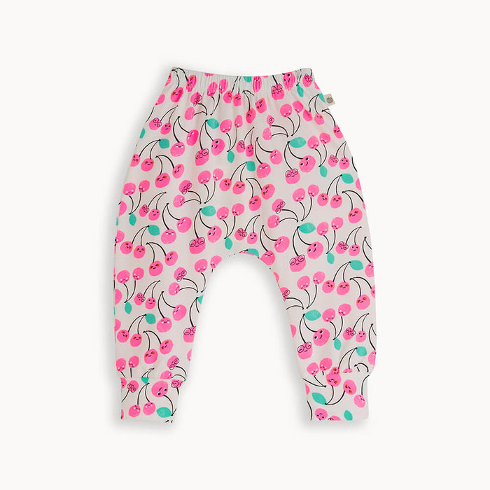 Super soft and comfy baby and toddler summer trousers in a fun pink 'cherry' print, made from super soft GOTS certified organic cotton. The relaxed, hareem style fit makes them extra flexible and baby sizes allow for plenty of room for nappies / diapers. The elasticated waistband keeps them nice and secure. Pair with matching top halves and knits for a sustainable summer outfit for babies and kids.