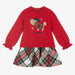 Red sweatshirt and skirt set for little girls by Mayoral. The top is knitted in a cotton blend with a dog appliqué on the front and it fastens with buttons on the back. The set comes with an ivory, red and green tartan skirt, which is lined in cotton voile and has an elasticated, adjustable waistband.
