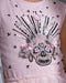 Featuring a shining sugar skull motif that is decorated with shimmering sequins, beads, studs and handmade organza flowers.