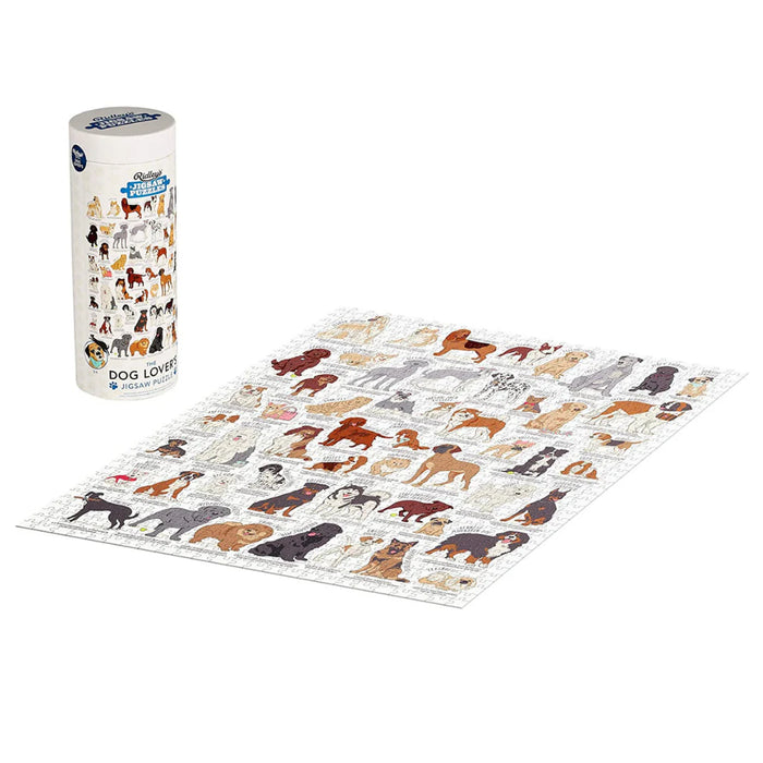 Enjoy hours of fun with man's best friend! Connect the pieces to reveal this barkingly mad Ridley's Games Dog Lover's 1000 piece jigsaw puzzle in a gloss varnish finish. The original jigsaw features 54 hand-drawn dog illustrations and interesting characteristics of each breed.