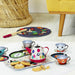 Vilac tin tea set is a simple toy at first sight but also a great educational support that will allow children, girls and boys to grow up while having fun! The colours of this tea set are bright and poetic. Attractive and stylish, they take up the colours of the rainbow and are a very nice support to initiate the child to art and drawing. At the age of 3, children start to acquire fine motor skills and this dinner set will help them become more precise in their movements. They will learn to arrange the cups on each saucer, to stack the plates, to sort, to arrange by size like the grown-ups, to the delight of their cuddly toys and dolls. Carrying the whole tea set on the magnificent tray will also be a challenge for these little ones, a real circus act! It will be an opportunity to gain self-confidence and to train, to repeat the same gestures over and over again without the unfortunate consequences of real life. It will be an opportunity to receive the congratulations of the adults, necessary for their psychological development. Alone, independently, the children will be able to take advantage of the calm to develop stories from real-life or ones that are completely made up using the dinner set as the centre of the game. They can thus relive real-life situations, such as a birthday party or a simple meal, with their cuddly toys and dolls as partners and the soft melody of the teapot as the musical background. A great time to socialize, as is the case during a meal, "playing with the tea set" with other children or adults will give the children the opportunity to discuss, develop and improve their vocabulary by sharing a cozy moment with others, as they do in their daily lives. This durable tea set will last for years and will continue to be a must-have toy as the child grows up. 14 piece Musical Tin Tea Set illustrated by Andy Westface. Produced by VILAC. Note: the teapot plays music when you tip it to pour the tea. Box measures 35 x 21 x 10.5 cm. Safety rated for ages 3+.