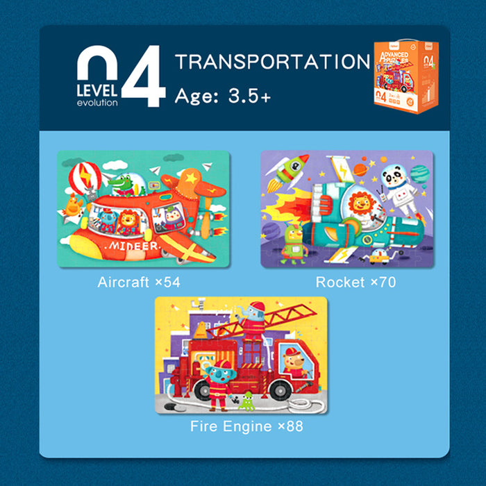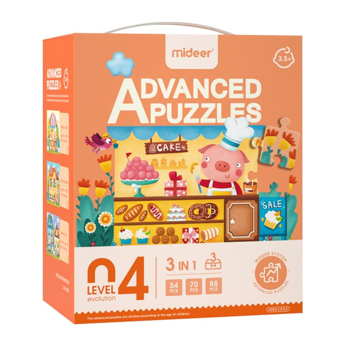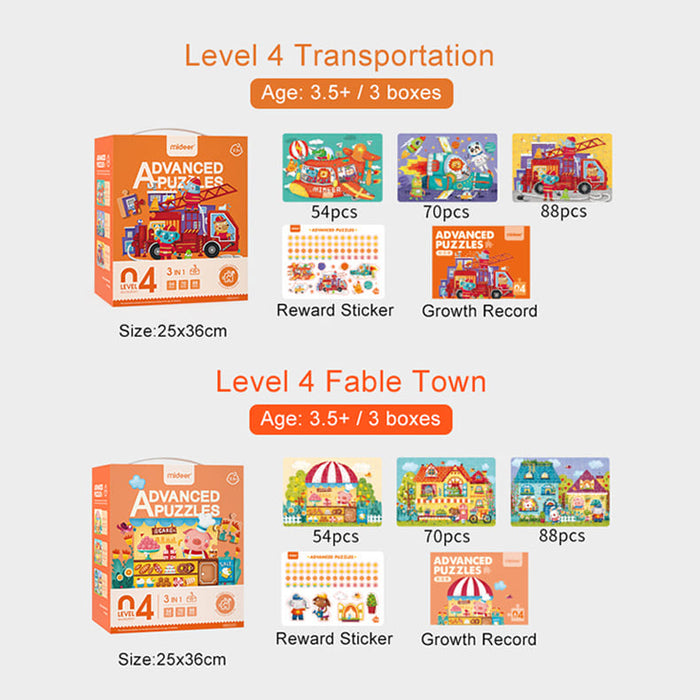 - Each box contains 2 to 4 sets of thematic and progressive puzzles + stickers + one growth chart.