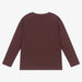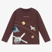 Burgundy red long-sleeved top for boys by Mayoral, made in soft and comfortable sustainable cotton jersey. It has a space exploration print on the front in white, blue and orange, with the words 'Adventure is out there'.